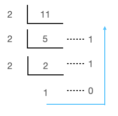- 10진수를 몫이 1이 될때까지 2로 나눈다.