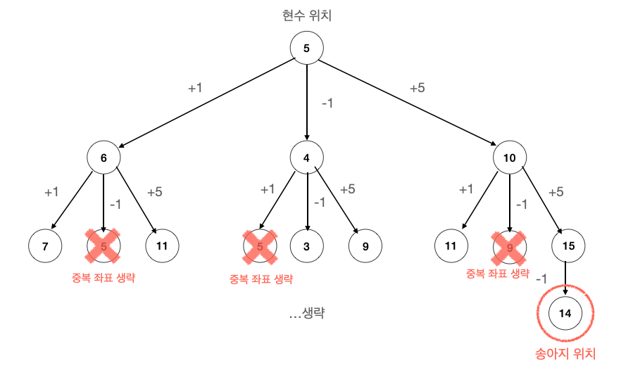 - 문제 설명 : 수직선상 좌표에서 현수의 위치에서 송아지의 위치까지 갈 수 있는 최소한의 점프 횟수를 구하는 문제(한 번의 점프로 앞으로 1 or 뒤로 1 or 앞으로 5 이동 가능)