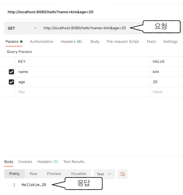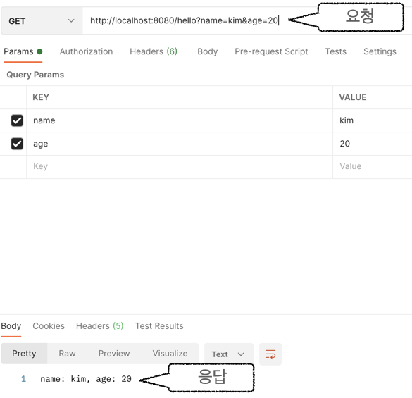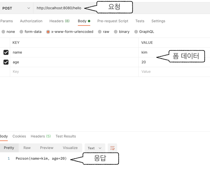 요청 응답 결과를 보면 name과 age값이 정상적으로 전달된 것을 확인할 수 있습니다.