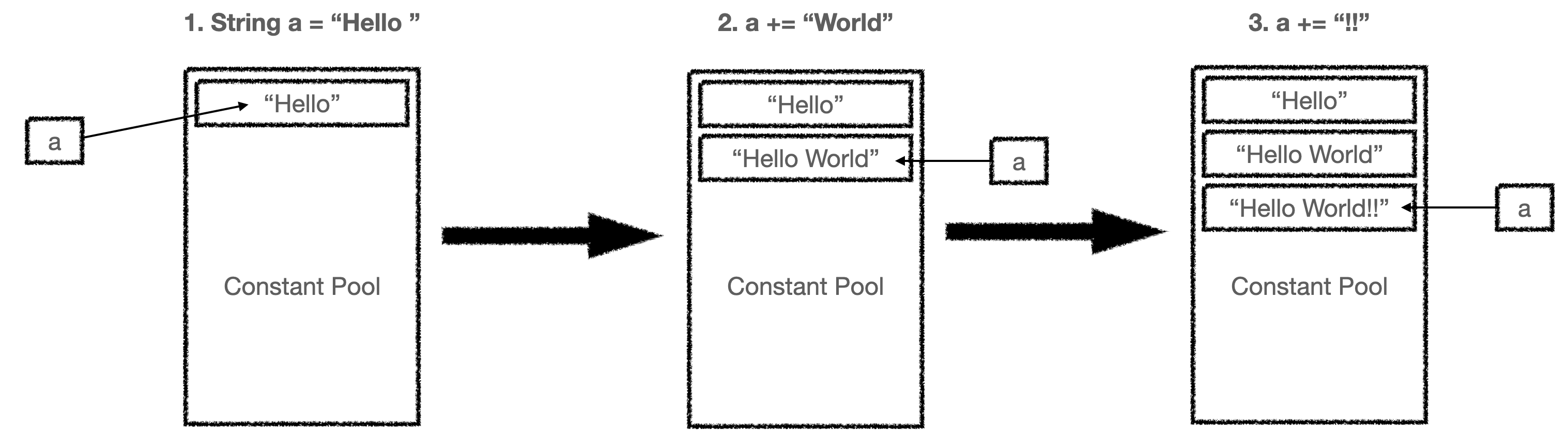 얼핏 보면 단순히 "Hello " 문자열에 "World", "!!" 문자열이 더해져서 출력되는 것 같지만 ConstantPool을 살펴보면 아래 그림과 같이 "Hello World", "Hello World!!" 라는 문자열이 추가적으로 새로 생성된 것을 볼 수 있고, String 문자열을 연산하는 것은 비효율적인 것을 알 수 있습니다.