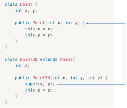 }예를 들어 위와 같이 조상 클래스와 자손 클래스에 같은 이름의 멤버가 사용되었을 때 super 키워드를 사용하여 구별할 수 있고, 메소드 오버라이딩의 경우에도 자손 메소드와 조상 메소드를 구별할 수 있다.