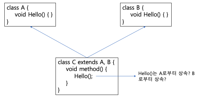 자바에서는 다중 상속의 이러한 문제점 때문에 단일 상속만을 허용한다.