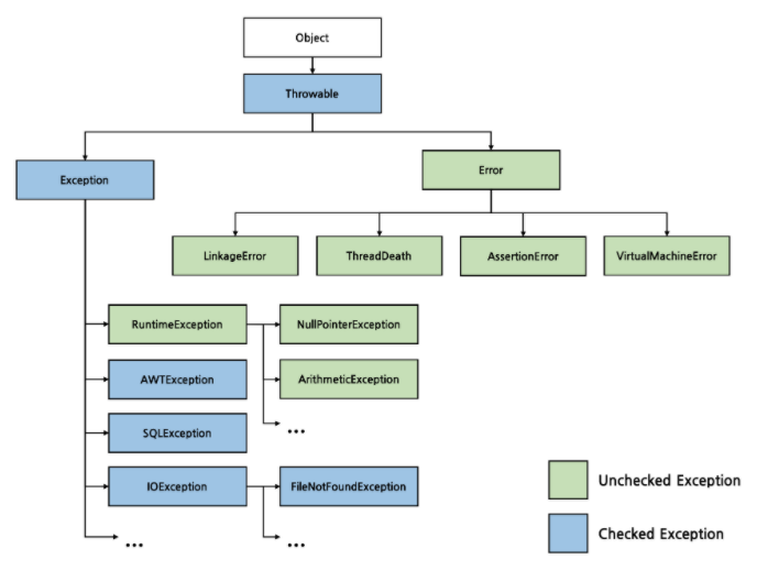 모든 예외의 최고 조상은 Excepton 클래스이며, 위 그림에서 볼 수 있듯이 두 가지 분류로 나눌 수 있다.