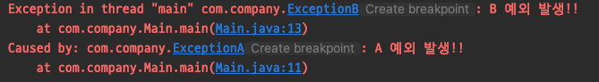 결과를 보면 A예외에 의해 B예외가 발생했다고 출력되는 것을 볼 수 있다.