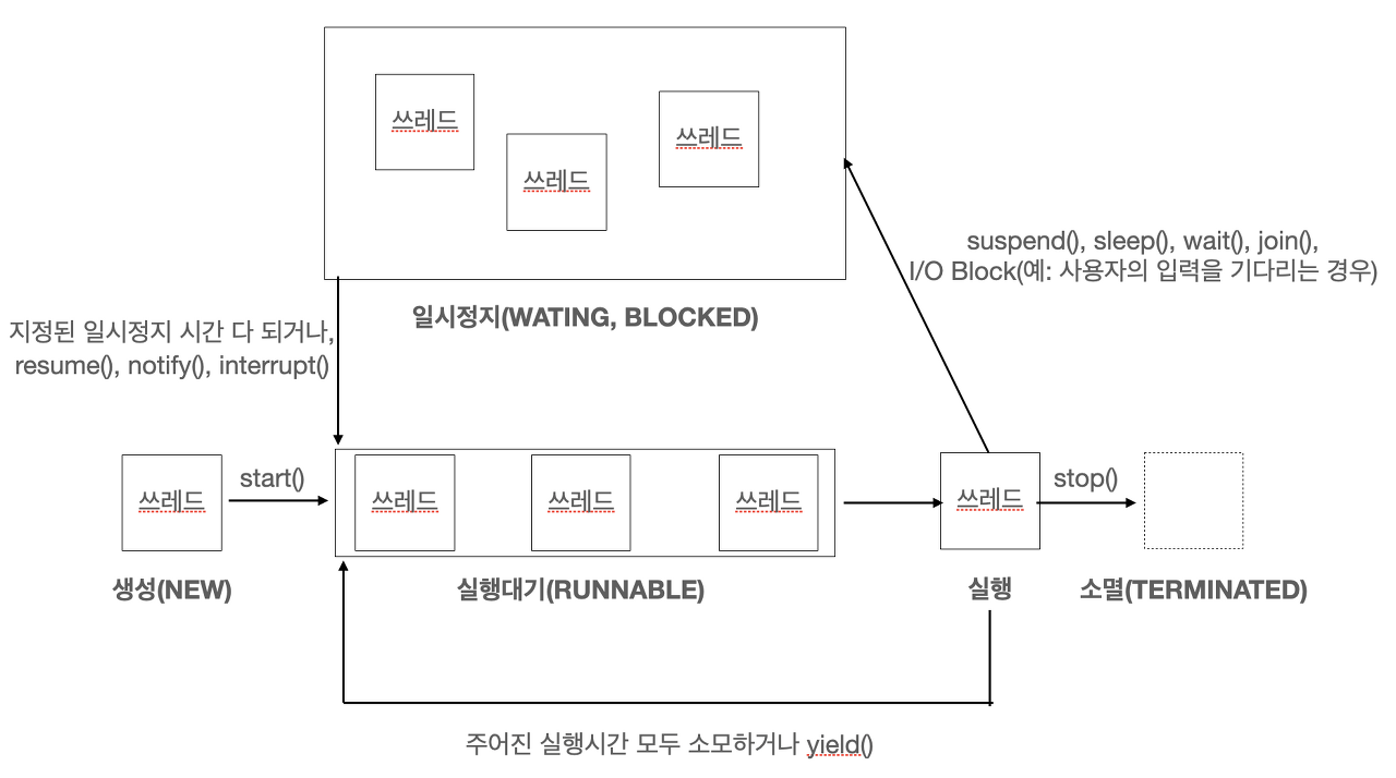 - 예를 들어 1초의 실행시간을 할당받은 쓰레드가 0.5초를 실행한 상태에서 yield()를 호출하면, 나머지 0.5초는 포기하고 실행 대기 상태가 된다.