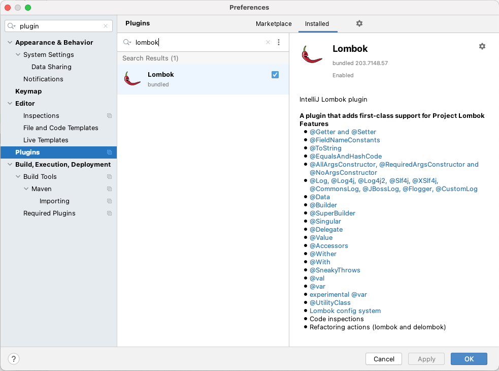 - Preferences -> plusgins -> lombok 검색하여 설치