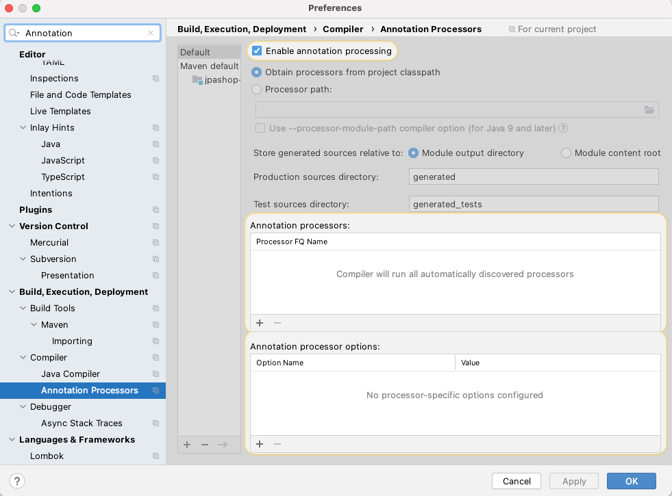 - Preferences -> Annotation Processors -> Enable annotation processing 활성화
