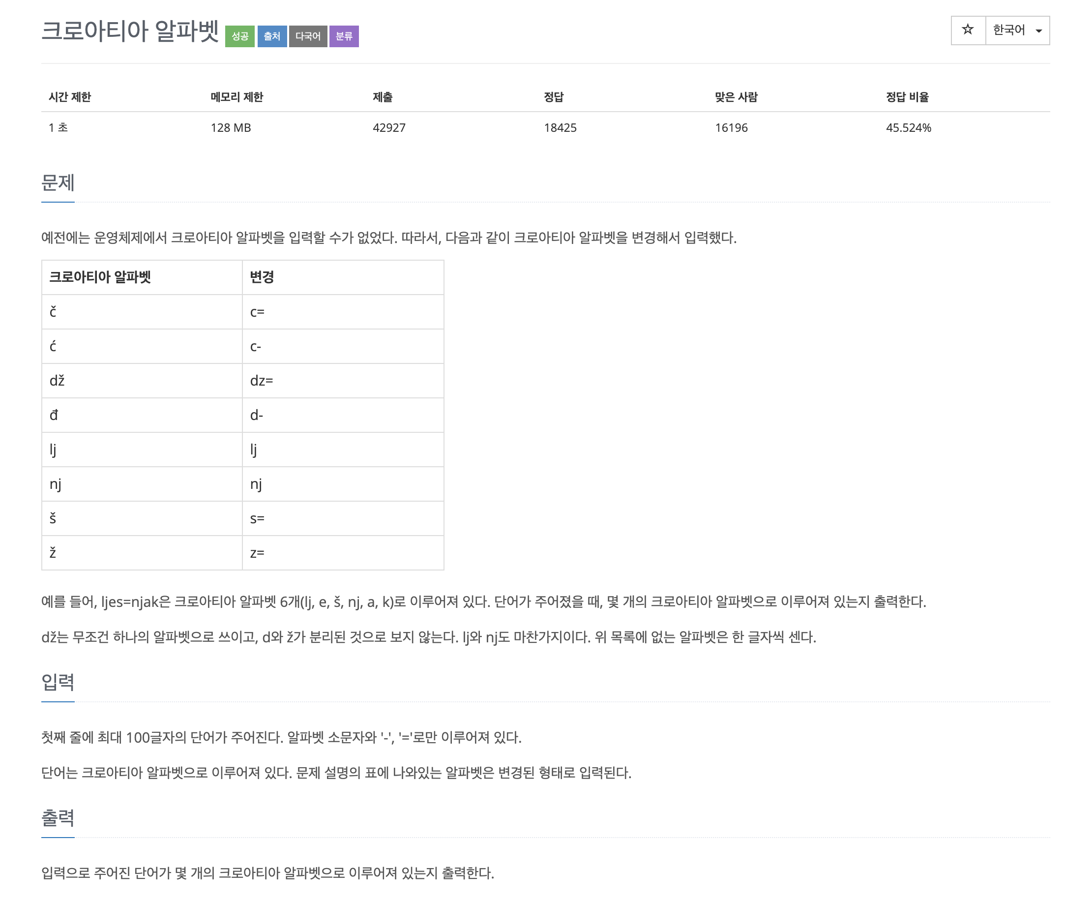 단순히 문자열의 길이만 알면 되는 문제이기 때문에 replace 메서드를 이용하여 크로아티아 문자를 아무 의미 없는 문자 1개로 치환하여 문자열의 길이를 출력해 주었습니다.