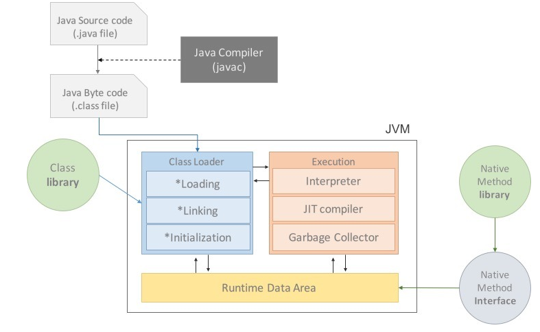 - Execution Engine : 클래스 로더가 JVM내의 Runtime Data Areas에 바이트코드를 배치시키고, 실행 엔진에 의해서 바이트코드가 기계어로 변환된다. 실행 엔진의 종류에는 Interpreter와 JIT Compiler가 있습니다.
