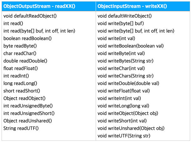 하지만, ObjectInputStream, ObjectOutputStream을 사용하면 간편하게 객체를 직렬화/역직렬화 할 수 있다.